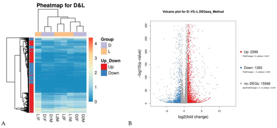 Transcriptome analysis of genes between the Duroc pig and Luchuan pig. (A) Heatmap analysis of gene expression based on the log10 ratio fold-change data. The horizontal axis represents samples, and the vertical axis represents differentially expressed genes that are upregulation and downregulation in red color and blue color, respectively. The color scale indicates gene expression based on log10 ratio fold-change data. (B) Volcano plot of significant differences in gene expression between the Duroc pig and Luchuan pig. Red spots represent the upregulation of genes, and blue dots are downregulated genes. Log2 FC indicates the fold change between the Duroc pig and the Luchuan pig. The longitudinal coordinates indicate the natural logarithm of the magnitude of the control groups. The longitudinal coordinates indicate the magnitude of differences at the transcriptional level.