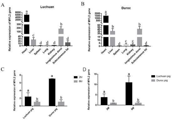 Expression pattern of the MYL2 gene. (A,B): MYL2 mRNA expression pattern in different tissues of two-month-old Duroc and Luchuan pigs. (C,D): MYL2 mRNA expression pattern in different pig breeds and developmental periods. Different letters indicate a significant difference (p < 0.05). All the results are expressed as means ± SD.