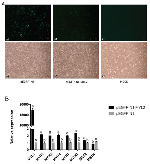 (A) The plasmid was transfected into C2C12 cells. (a1–c1), cells were observed under a fluorescence microscope at 10×; (a2–c2), cells observed under an optical microscope at 10×. (a1,a2), cells transfected with pEGFP-N1; (b1,b2), cells transfected with pEGFP-N1-MYL2; (c1,c2), blank control group. (B) The mRNA expression change of MYL2, MYH1, MYH2, MYH4, MYH7, MYOD, MEF2 and MSTN after transfecting an overexpression vector of MYL2 into C2C12 cells. Different letters indicate a significant difference (p < 0.05). All of the results are expressed as means ± SD.