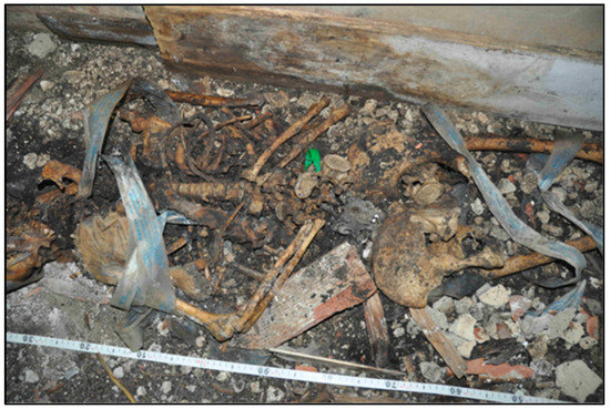 The skeletal remains were found on the fourth floor of an abandoned farmhouse in the industrial area of a city in Southern Italy, partially covered by a wooden box and some wooden planks, arranged as a funeral bed (Figure 1).