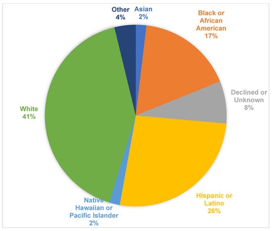 One-hundred and eighteen patients with a clinical diagnosis of OA or OCA were identified, of which fifty-three (45%) had previously undergone genetic testing (Supplemental Table S1). In the cohort with genetic testing results, the average age at initial evaluation was 1.3 ± 2.0 years (median 0.6, range 0.05–10) and two-thirds were male (Table 1). Forty-two percent of the patients identified as White while 26% were Hispanic and 17% were Black (Figure 1). In total, 17 of 48 (35%) patients endorsed a family history of albinism, while information regarding family history of albinism for 5 patients were unavailable. Forty-one (77%) patients had a diagnosis of OCA and 12 (23%) had a diagnosis of OA, based on clinical findings (absence or presence of cutaneous findings). Five (9%) patients were diagnosed with Hermansky–Pudlak syndrome based on genetic testing. Only one patient (Patient #6 in Supplemental Table S1) with Hermansky-Pudlak syndrome had only ocular findings without cutaneous involvement.