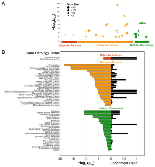 Pathway analysis of 33 distinct variant genes (AP3D1, ARHGEF18, CACNA2D4, CDH23, CNGA3, COL18A1, CTNNA1, CYP4V2, FSCN2, GPR143, GPR179, HMX1, HPS1, HPS4, HPS5, HPS6, IDH3A, KIF7, LRP2, LYST, MC1R, MPDZ, MTTP, OCA2, PCDH15, RAB27A, RIMS1, RP1, SLC45A2, SLC7A14, TYR, TYRP1, ZNF423) from our 53 patients using gProfiler showed that molecular function, biological process, and cellular component annotations all featured enriched terms consistent with pigmentation at the level of the melanosome in our gene set (Figure 2). Significant terms that shared overlap with genes identified as having positive diagnostic yield were melanin biosynthetic process (OCA2, TYR, TYRP1; GO:0042438; p = 4.16 × 10−7), pigment biosynthetic process (GPR143, SLC45A2; GO:0046148; p = 5.75 × 10−7), melanocyte differentiation (HPS4, HPS6; GO:0030318; p = 8.11 × 10−7), and BLOC complex (HPS1, HPS5; GO:0031082; p = 7.29 × 10−6).