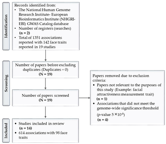 The results shown in the identification stage of (Figure 1) were obtained by first searching the register “facial morphology measurement” trait in the GWAS Catalog on 30 April 2022. Facial morphology measurement was described as the “quantification of some aspect of facial morphology” such as “lip thickness”, “forehead height”, or “chin protrusion” [156]. The results included 1101 SNP associations with 109 traits in 19 publications (p-value 1 × 10−79–9 × 10−2) [91,146,154,157,158,159,160,161,162,163,164,165,166,167,168,169,170,171,172]. However, this search did not reveal facial features regarding the nose area. As a result, another search was conducted on the “nose morphology measurement” trait, which was described as the “quantification of some aspect of nose morphology”, such as “nose wing breadth”, “nose tip shape”, or “nose profile” [156]. A total of 250 associations resulted from this search, with 33 nose traits in 11 studies [146,154,157,158,160,161,162,163,165,168,169]. From these two searches, a total of 1351 associations with 142 facial traits were reported in a total of 19 GWAS studies [91,146,154,157,158,159,160,161,162,163,164,165,166,167,168,169,170,171,172]. A total of five papers were excluded [91,157,166,167,172].