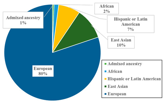 Analysis of population backgrounds in these papers revealed that most of the studied populations were of European ancestry (80%), followed by East Asians (10%), Hispanic or Latin Americans (7%), Africans (2%), and those of Admixed ancestry (1%) (Figure 2). Such results support the persistent European bias in GWAS data, which was previously reported in 2016 [30].