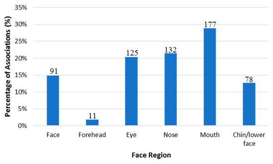 For the purposes of this review, the “facial attractiveness measurement” trait was excluded due to its non-relevance to facial feature prediction using DNA. In addition, only SNPs that met the GWAS p-value threshold of (5 × 10−8) or higher were reported. This threshold was selected based on the Bonferroni correction method. This method accounts for the p-value based on the assumption that every SNP is tested independently of an array [173]. It considers the linkage disequilibrium (LD) that may present between SNPs of the same array. As a result, the calculation considers that there are, based on the genome, 1,000,000 possible LD. Thus, 0.05/1,000,000 will yield this threshold (p < 5 × 10−8) [174]. This is considered one of the most conservative methods for selecting the p-value threshold [174,175]. In addition, note that the database reports one p-value for the correlated trait, which may be the p-value of discovery, replication, or meta-analysis. Therefore, the database was used as a filtering tool for all SNPs that reached the genome-wide significance threshold. A total of 614 associations with 98 traits (p-value 1 × 10−79–5 × 10−8) met our inclusion criteria (Tables S1–S6). Figure 3 demonstrates the distribution of these associations according to six facial regions (facial traits affecting multiple areas of the face, forehead, nose, mouth, lip, and chin/lower face). Most of the associations were found in the mouth area (29%), followed by the nose (21%), eye (20%), face (15%), chin/lower face (13%), and forehead (2%).