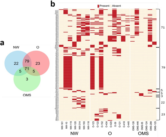 To know the crAssphages individuality among the samples, we examined which genomes were shared among the three groups and observed the 71 phages shared among the three groups. Additionally, several phages were unique for each group (Figure 2a). The presence/absence of the genomes is presented in Figure 2b for each sample.