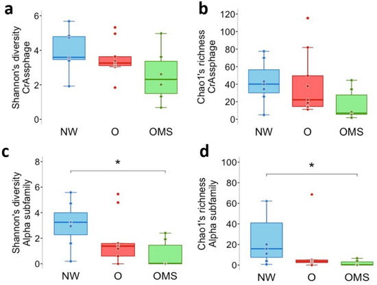 In order to further analyze the crAssphage dynamics, we examined phage richness and diversity for the crAssphage family and separated them into each subfamily. The analysis at the family level showed that phage diversity and richness decreased in O and OMS compared to NW (Figure 4a,b). However, the differences among the groups were not significant. Notably, when we analyzed the subfamily level, we found that the diversity (p = 0.018) and richness (p = 0.018) of Alpha showed a significant decrease in OMS when compared to NW (Figure 4c,d). We also performed a β-diversity analysis to understand if crAssphage clustering was associated with the O and OMS groups; however, no clustering was observed.