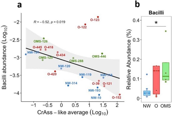 3.5. Increased Bacilli Were Associated with Decreased crAssphage Abundance in OMS