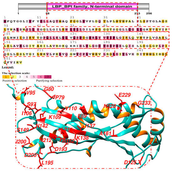 The second stage was to utilize the maximum probability estimate to locate amino acid positions that were the subject of positive selection throughout the course of evolution. The Bayes theorem, which predicts the posterior probabilities of the sites that are subject to positive selection, was used to successfully accomplish this goal. Positive selection was observed to be operating at amino acid locations with posterior probabilities ranging from 95% to 99% [33]. Amino acid residues with a high probability that the value was greater than one were subjected to selective procedure. The Swiss model and Phyre 2 (http://www.sbg.bio.ic.ec.k/phyre/html, accessed on 28 September 2021) are web-based applications that display the locations of favorably selected amino acids on protein structures [34]. We predicted the location of evolutionary conservation of nucleic acids and amino acids in the protein using the ConSurf tool (http://consurftest.tau.ac.il, accessed on 28 September 2021), which was based on the phylogenetic relationship between sequences [35]. The sequence of the aligned codon of BPIFA1 was examined in Selecton version 2.2 (http://secton.tau.ac.il, accessed on 28 September 2021), which permits determining the varied ratios of various codons inside the aligned sequences. These ratios were measured using the Bayesian inference approach through various likelihood tests. This was performed to confirm positively selected codons [36]. Moreover, the Selecton results were shown in various colors to denote the various selection criteria.
