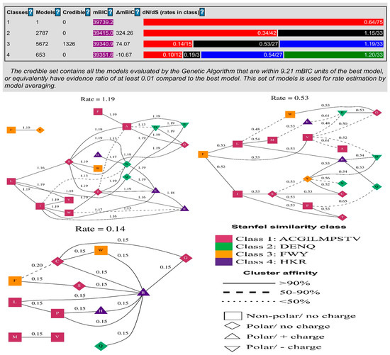 Identification of physiologically significant regions of a protein can be performed by contrasting the frequency of synonymous (Ks) and non-synonymous (Ka) substitutions in the protein. This provides the basis for concluding the existence of purifying selection and localized positive Darwinian selection. We used Selecton v. 2.2 (accessible at http://selecton-bioinfo-tau.ac.il, accessed on 29 September 2021), a web server that automatically calculates the ratio of Ka to Ks (u) at each site in the protein. Different colors represent different types of selection (positive selection, purifying selection, and no selection) and are used to graphically display this ratio at each site. The Selecton model is a collection of different evolutionary hypotheses that can be used to statistically test the likelihood that a given protein has been subjected to positive selection. It operates via a graphical user interface. The recently established mechanistic-empirical model influenced the amino acid’s physical properties (Table 3).