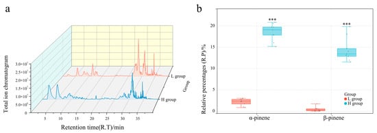 Comparison of phenotypic characteristics between L and H groups. (a) Total ion chromatogram of L and H group samples. (b) Comparison of α-pinene and β-pinene contents between L and H groups; *** p < 0.0001.