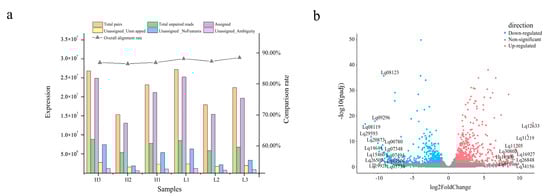 Gene expression quantification and differentially expressed gene (DEG) identification in the transcriptome. (a) Sequence alignment and expression quantification of sequenced samples. (b) Differentially expressed genes. Horizontal coordinates indicate the logarithmic values of the fold difference between H and L groups, while vertical coordinates indicate the -log10 value of the false discovery rate (FDR) of the difference between the two subgroups. Orange–red points and blue–green points indicate upregulated and downregulated expression in the H vs. L groups, respectively, while gray points indicate no significant differences.