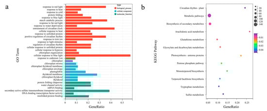 The synthesis of related secondary metabolites may be regulated by DEGs at the transcriptional level. Gene Ontology enrichment analyses were performed to reveal the biological functions of L. formosana leaves to exhaustively explore the presumed function of DEGs (Supplementary Table S4). The main molecular function (MF), cellular component (CC), and biological process (BP) categories were identified. A total of 1202 DEGs were clustered into 21 biological processes, eight cellular components, and six molecular functions (Figure 3a). Most subcategories were related to the cellular response to blue light, entrainment of the circadian clock, starch catabolic processes, and positive regulation of circadian rhythm in the BP categories. The largest percentages of DEGs in the CC category were related to the thylakoid membrane, protein-folding chaperones, and plastoglobules. There were only eight subcategories enriched in cellular components. This mainly included secondary active sulfate transmembrane transporter activity and water channel activity.
