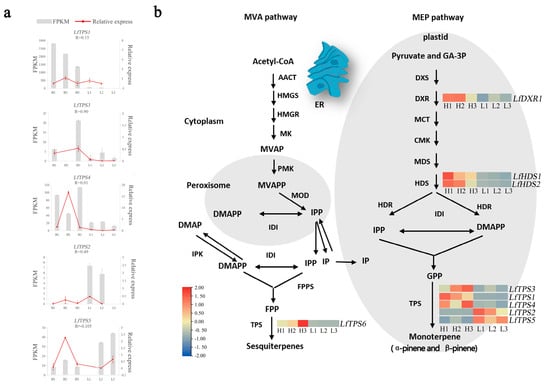 Terpenoid content is a complex and diverse cause of species differences in various environments [,]. Pathways related to α-pinene and β-pinene biosynthesis and molecular regulation of L. formosana are not extensively elucidated compared with other well-studied plant families such as Lamiaceae [], Pinaceae [], and Apiaceae. High-throughput sequencing techniques have rapidly increased our knowledge and understanding of the biosynthesis and molecular regulatory frameworks of valuable phytochemicals by generating transcriptome sequence data from important plants []. This study performed transcriptome sequencing of six trees of L. formosana leaves. This provides insights into the molecular mechanisms underlying terpenoid synthesis in L. formosana. The H group had mostly higher expression of the DEGs relevant to the terpenoid biosynthesis pathway compared with those in the L group. This indicated that the H group had enhanced terpenoid synthesis. Terpenoids consist of IPP (C5) units that are derived from two distinguishable biochemical pathways in plants: the plastidial MEP pathway and the cytosolic acetate-MVA pathway. However, monoterpenoids are solely produced by the MEP pathway from IPP [,]. The MEP pathway is involved in the synthesis of IPP and DMIPP by seven enzymes (DXS, DXR, MCT, CMK, MDS, HDS, and HDR). DXS is a key enzyme in the MEP pathway and some studies suggest that DXS regulates monoterpene production and is mainly involved in the buildup of linalool, geraniol, α-terpinol, and other substances in grape aroma and Freesia hybrida [,,]. Kiwifruit has two DXS genes, with co-expression of DXS1 and TPS genes significantly increasing monoterpenoid accumulation []. DXS overexpression in peppermint enhances the accumulation of essential oil substances []. DXR encodes the second key enzyme in the MEP pathway, is the process’s rate-limiting enzyme, is an effective regulatory target, and is involved in terpene synthesis []. HDR genes influence the ultimate synthesis of terpenoids by indirectly regulating isoprene synthesis. GPPS6 is distributed in secretory gland cells and chloroplasts and indirectly regulates monoterpene biosynthesis. This study showed that the DXR, HDR, and GPPS genes were highly expressed in the H group, and we presumed that they are involved in the regulation of principal compounds in L. formosana leaf fragrance.