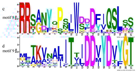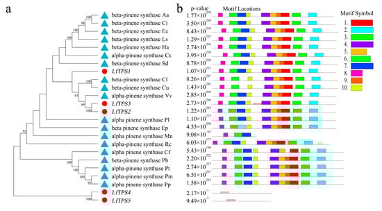 Phylogenetic analysis was performed based on published terpene synthase genes associated with the synthesis of α-pinene and β-pinene, combined with the corresponding amino acid sequences (Figure 5a). LfTPS3, LfTPS2, and LfTPS1 were highly homologous to α-pinene and β-pinene synthases of other species, such as Vitis vinifera. LfTPS4 and LfTPS5 are members of distinct branches. Conserved motif analysis performed with the MEME program revealed that TPS members clustered in the same branch had similar motif characteristics (Figure 5b). The predicted results indicated that LfTPS3, LfTPS1, LfTPS2, and other published terpene synthase genes contained 10 identical motifs with the same sequence. For example, the RR (X) 8W and DD (X) 2D motifs (Figure 5c,d). An identical motif was not detected in LfTPS4 and LfTPS5. Furthermore, Pfam analysis of all motif sequences showed that motifs 1, 2, 3, 4, 5, and 9 were located in the C-terminal domain of TPS, and motifs 6, 7, and 10 were located in the N-terminal domain of TPS. LfTPS3, LfTPS1, and LfTPS2 all contained the C-terminal and N-terminal TPS domains.