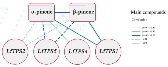 A correlation analysis was performed to clarify the relationship between the TPM values of the five TPS genes and terpene content and form correlation networks (Supplementary Table S6). The correlation coefficients between LfTPS3 and α-pinene and β-pinene were >0.6, and the p-values were >0.05; therefore, this gene was not selected for further correlation analysis. The correlation network expression pattern showed that LfTPS1 expression positively correlated with α-pinene and β-pinene accumulation, whereas LfTPS5 and LfTPS2 negatively correlated with the production of α-pinene and β-pinene. LfTPS4 positively correlated with α-pinene production (Figure 6).