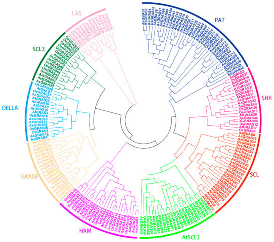 - Tian, C.; Wan, P.; Sun, S.; Li, J.; Chen, M. Genome-wide analysis of the GRAS gene family in rice and Arabidopsis. Plant Mol. Biol. 2004, 54, 519–532. [Google Scholar] [CrossRef]
