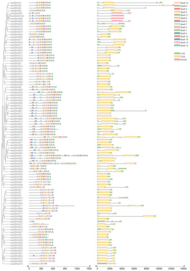 We found 100 AsGRAS members in this study, and the length of the AsGRAS protein ranged from 2406.74 to 7016.67. The molecular weights of the proteins of tomato, Medicago truncatula, and sweet potato ranged from 14,089.3 to 98,029.8, from 7939.17 to 129,425.86, and from 42,500.97 to 157,318.47, respectively [26,27,28]. The results show that the molecular weight of the protein of AsGRAS is less than that of the other plants, and the diversity is lower.