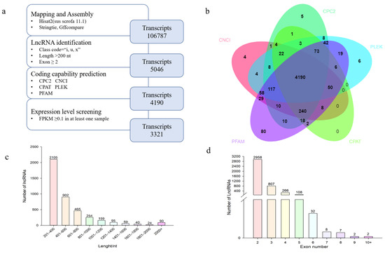 Identification and characterization of lncRNA. (a) Process of identifying lncRNA; (b) Venn plots of lncRNAs identified from Coding-Non-Coding-Index (CNCI), Coding Potential Calculator 2 (CPC2), predictor of long non-coding RNAs and messenger RNAs based on an improved k-mer scheme (PLEK), Coding Potential Assessing Tool (CPAT), and Pfam databases; (c) length distribution of lncRNAs; (d) exon number distribution of lncRNAs.