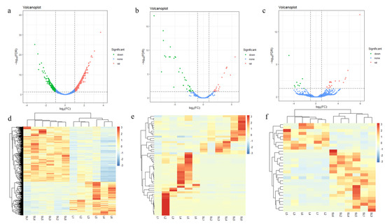 Three differentially expressed RNAs in Songliao black (SL) pigs and Landrace pigs. (a) Volcano plot of differentially expressed genes (DEGs); red represents up-regulation in SL pigs, green represents down-regulation in SL pigs, and blue represents no significant difference between SL pigs and Landrace, as below; (b) volcano plot of differentially expressed miRNA (DEMs); (c) volcano plot of differentially expressed lncRNAs (DELs); (d) heatmap of DEGs. The color code represents the expression value, red represents the high expression value, and blue represents the low expression value; SL stands for SL pig and L stands for Landrace; (e) heatmap of DEMs; (f) heatmap of DELs.