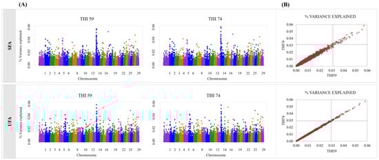 (A) Manhattan plots obtained by bi-trait analysis for THI59 and THI74 and (B) dispersion of the explained additive variance () in the quadrants defined by the truncation point of the top 50 SNPs, for percentage of saturated fatty acids (SFA) and unsaturated fatty acids (UFA). In (B), for SFA for example, the truncation point was 0.031%. Then the upper right quadrant shows the markers with for both environments. The lower left quadrant shows the markers with for both environments. The lower right quadrant shows the markers belonging to the top 50 for THI59 (i.e., for THI59). The upper left quadrant shows the markers belonging to the top 50 only for THI74 (i.e., for THI74).