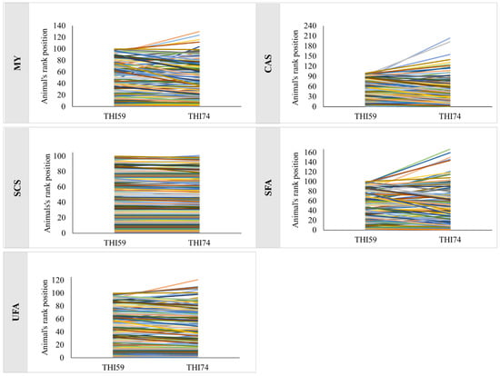 Spearman correlations were high, and, even at the lowest correlations, e.g., CAS and SFA (0.88), the animals in the top 10% were almost the same, changing rank only, as can be seen in Figure 3. For MY, five of the 100 animals selected in the THI59 would not be the best if classified in the THI74. For CAS, 14 of the 100 animals selected in the THI59 would not be the best if classified in the THI74. For SCS, the classification of animals practically did not change, suggesting that, for this selection percentage, the choice of the best animals would not depend on the THI value. For SFA, 12 of the 100 animals selected in the THI59 would not be the best if classified in the THI74. For UFA, six animals of the 100 animals selected in the THI59 would not be the best if classified in the THI74. If the animals of the studied population are selected for MY, CAS, SFA, and UFA based only on the effect of their markers, at a selection ratio of 10% or 40%, the animals selected will be practically the same, whether selected in THI59 or in THI74.