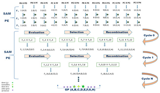 In this context, the combination of MAS and the recurrent selection method improves the study and maintenance of genetic diversity in populations from different generations, ensuring long-lasting selection gain. In addition, this strategy increases the frequency of favorable alleles and improves allele pyramiding by optimizing the development of new varieties [29].