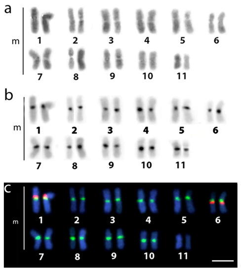 The diploid chromosome number in all analyzed fish was 2n = 22. The karyotype was exclusively composed of large metacentric chromosomes, with C-positive heterochromatin blocks found in the pericentromeric region of all chromosomes (Figure 2a,b). Except for pair number 11, all chromosomes displayed an 18S rDNA signal in the pericentromeric region, which was found in synteny with 5S rDNA localized on chromosomal pairs number 1 and 6 (Figure 2c).