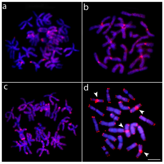 Metaphase chromosomes of N. anduzei after FISH hybridization with (a) (GA)15; (b) (CGG)10; (c) (CA)15 microsatellite DNA probes, and (d) (TTAGGG)n sequences. Arrowheads indicate the interstitial telomeric sites (ITS) observed on pairs 4 and 6. Scale Bar = 10 µm.