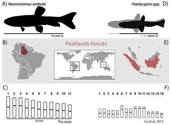 The main similarities between N. anduzei ((A–C) in this research) and Paedocypris spp. ((D–F)—[19]). (A,D) Representation of an adult specimen of N. anduzei with SL = 16 mm and Paedocypris spp. with SL = 8 mm. (B,E) Geographical maps with the distribution of both species and peatland forests highlighted in red. (C,F) Idiograms of both species’ chromosomal complements are dominated by large bi-armed chromosomes, revealing their probable fusion origin.