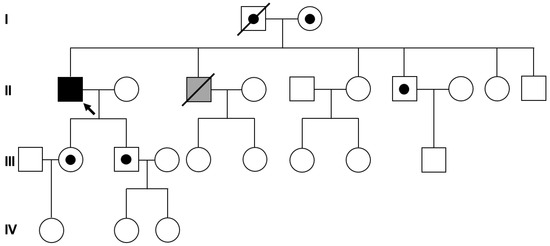 In the physical examination, muscle power was lower in both the lower and upper extremities. The muscles of the hip, knee, ankle, shoulder, and elbow were observed to be grade 1 in the manual muscular strength test (MMT); the wrist flexors and extensors were MMT grade 2; and the flexors and extensors of the fingers were MMT grade 3. All joints showed no contracture and full passive range of motion (ROM). His sensations were intact, and the deep tendon reflex showed hypoactivity without a pathologic reflex. Laboratory tests showed an elevated serum CK level of 352 IU/L, but there were no other abnormal findings (Table 1). We, therefore, suspected that the proband had MMD1 among the dysferlinopathy types based on the following clinical symptoms. The first recognized symptoms were at the distal part of the leg, which gradually progressed to difficulty with climbing stairs and walking. In addition, the onset of muscle weakness in the upper extremities appeared relatively later than that in the legs, and the proband still has small muscle strength of the hands. Because the proband’s parents (I-1 and I-2 in Figure 1), children (III-2 and III-3 in Figure 1), and grandchildren (IV-1, -2, and -3 in Figure 1) showed no clinical manifestations related to muscular dystrophy, even though his younger brother (II-3 in Figure 1) only presented with similar phenotypes, segregation analysis and genetic counseling were additionally conducted to resolve the genetic origin of dysferlinopathy in the proband.