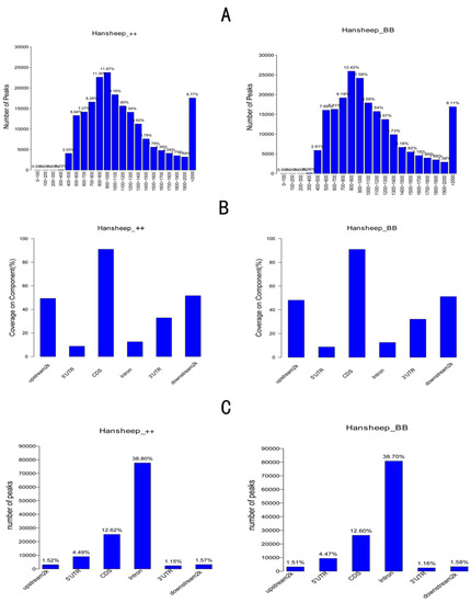 To study the differences in genomic methylation patterns between Han ++ and HanBB sheep, we detected the 5-mC enriched regions, termed methylated peaks, by MACS1.4.0. A total of 200,158 peaks with coverages of 8.94% were identified. The typical peak lengths were 500–1400 bp or more than 2000 bp. Nearly one-fourth of peaks contained 10–15 CpG dinucleotides, and less than 20% of peaks contained more than 35 CpG sites (Figure 2). In two types of sheep, methylation peaks covered 90% of CDS, and 50% of upstream2k and downstream2k components were methylated. In the two types of sheep, the number of peaks in the intron region accounted for nearly 39% of the total peaks, and the coverage of peaks in the intron region was 12.5% in whole genome-wide (Figure 2).