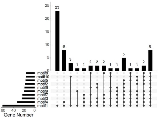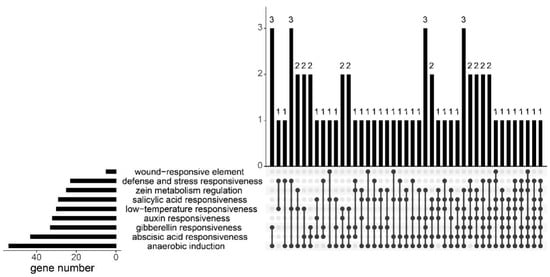 After we downloaded the genomic sequences and CDS sequences of BnaGYFs from Ensemblplants (https://plants.ensembl.org/index.html, accessed on 13 January 2023), like in former studies [], GSDS2.0 was recruited to draw the gene structure of BnaGYFs, and MEME suite [] was recruited for the motif prediction of BnaGYFs. Similar to former studies [], we conducted cis-element prediction, the promoter regions (about 2000-bp upstream) of BnaGYFs were extracted from genome general feature format (GFF) files using PlantCARE (http://bioinformatics.psb.ugent.be/webtools/plantcare/html/, accessed on 13 January 2023), and visualized by TBtools []. Sequence alignments by Muscle, and a neighbor-joining (NJ) tree was generated with the alignments using MEGA 11.0 software with bootstrap analysis from 5000 replicates. The phylogenetic tree was modified by Adobe Illustrator. Upset plots for motifs and cis-elements were generated on SRplot website (http://www.bioinformatics.com.cn/en?keywords=upsetR, accessed on 13 January 2023).
