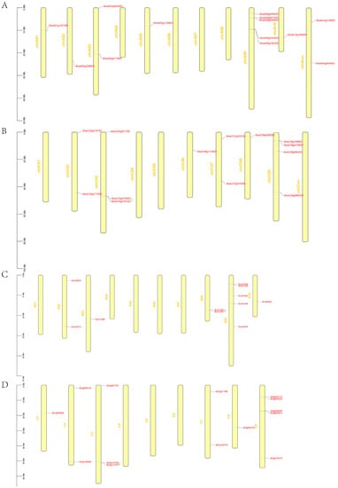 Locations of Brassica GYFs on chromosomes. (A,B) Locations of GYFs on A or C subgenome in Brassica napus. (C) Locations of GYFs on chromosomes in Brassica rapa. (D) Locations of GYFs on chromosomes in Brassica oleracea. A01-A09, C1-C9, and chrA01-chrCnn represent the chromosome number in B. rapa, B. oleracea, and B. napus, respectively. The green line represents tandem duplication.