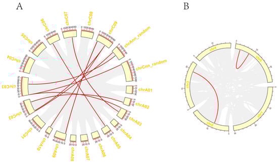 Duplication of BnaGYFs and AtGYFs. (A) Duplication of GYFs in B. napus. (B) Duplication of GYFs in Arabidopsis thaliana. The red line represents the gene pairs, and the yellow boxes represent the chromosomes.