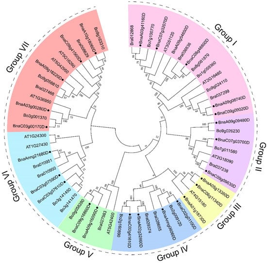 Phylogenetic tree of GYF proteins in B. napus (●), B. rapa, B. oleracea, and A. thaliana. The phylogenetic tree was generated by the NJ method with bootstrap analysis (5000 bootstrap replicates) using an amino acid sequence alignment of GYF proteins from B. napus (●), B. rapa, B. oleracea, and A. thaliana by the MEGA 11.0 program. GYF proteins were divided into 7 groups.