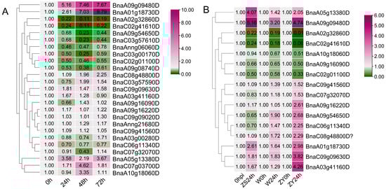 Gene expression heat map of GYFs in rapeseed cultivars induced by Sclerotinia sclerotiorum. (A) Gene expression heat map of ZHONGSHUANG11 (ZS11) infected by S. sclerotiorum at 24, 48, and 72 h post-inoculation. (B) Gene expression heat map of ZS11, Westar (W), and ZHONGYOU821 (ZY821) infected by S. sclerotiorum at 24 h post-inoculation.