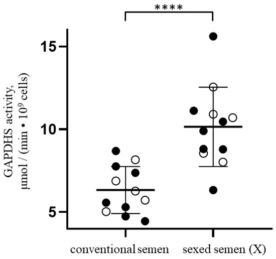 GAPDHS enzymatic activity in spermatozoa from frozen-thawed samples of sexed (X spermatozoa) and conventional bovine sperm derived from the same bull (white circles) or from different animals (shown with black dots). **** p-value < 0.0001. The bold line corresponds to the mean value and error bars indicate standard deviation.