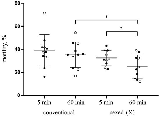 Percentage of motile sperm among the total number of gametes at the beginning (5 min post-thawing) and at the end (60 min post-thawing) of incubation at 37 °C in frozen-thawed samples of sexed (X spermatozoa) and conventional bovine sperm derived from the same bull (white circles) or from different animals (shown with black dots). * p-value < 0.05. The bold line corresponds to mean value and error bars indicate standard deviation.