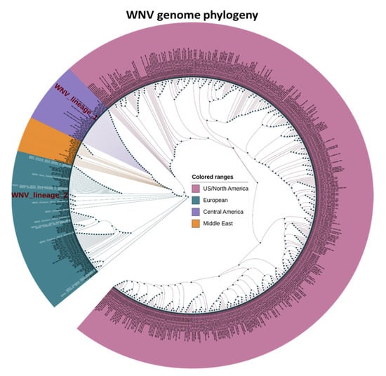 3.2. Phylogenetic Analysis of WNV Full Genomic Sequence