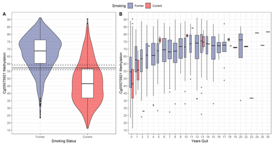 Panel B shows the boxplots of cg05575921 methylation by smoking status and years quit. For both smoking groups, cg05575921 methylation tended to increase with years quit. There were 119 (8%) self-reported former smokers who had 0 years quit, and 14 (1%) current smokers who reported more than 0 years quit, the latter being attributable to measurement error. For 0 years quit, the current smokers’ distribution was shifted downward relative to the former smokers’ distribution. For current smokers who reported greater than 1 year quit, their cg05575921 methylation medians tended to be at or above those of former smokers.