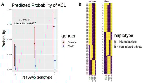 For the significant association with rs13946 in females, we performed an interaction analysis between the additive model and sex for ACL injury. We observed a significant change between sexes in the association between the C-allele and risk of ACL (p = 0.027) (Figure 1A), suggesting a female-specific risk with the presence of the C-allele.