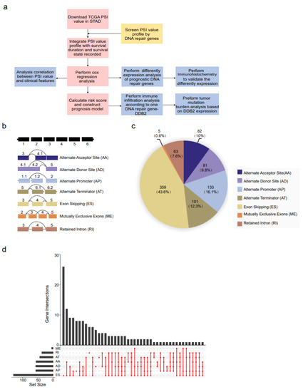 The percentage spliced-in (PSI) values of alternative splicing events of stomach adenocarcinoma were gained from the TCGA SpliceSeq database (https://bioinformatics.mdanderson.org/TCGASpliceSeq/, accessed on 12 May 2021), which collected alternative mRNA splicing from the TCGA cancer database [12]. Transcriptome sequencing data of stomach adenocarcinoma specimens retrieved from patients who suffered from stomach cancer with their clinical traits were obtained from the TCGA database. Seventy-five percent of samples with PSI values were set as splice event filters. DNA repair genes were retrieved from a widely acknowledged gene list [13] to screen the alternative splicing events, which were displayed by UpSet plot. Alternative splicing events were integrated with the overall survival data of STAD patients for further analysis by Perl software.