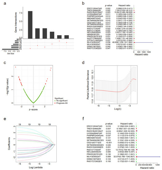 Results and constructions of the independent prognostic model. (a) UpSet plots of seven kinds of prognosis-related optional splicing events and their parent genes. The lower part of every plot describes the permutations of the optional splicing events; for every situation, the optional splicing event is comprised if its counterpart is full of a red dot. The higher part of the plot symbolizes the amounts of genes for every situation. Average PSI value ≤ 0.05. (b) The forest plot of prognosis-related AS events in the STAD cohort. (c) The volcano plot of prognosis-related AS events in the STAD cohort. (d) Lasso plot determining the amount of whole survival-related splicing events in the survival analysis by Lasso regression. (e) Lambda plot determining the number of whole survival-related splicing events in the survival analysis by Lasso regression. (f) The forest plot of the univariate Cox regression analysis for DNA repair gene alternative splicing.