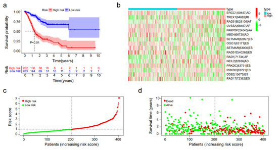 The risk score was computed in accordance with the PSI value and coefficients of these 16 prognostic alternative splicing events. The survival of high-risk patients and low-risk patients separated by the median risk score was analyzed by Kaplan-Meier analysis. As shown in Figure 3a, the signatures could efficiently distinguish the low-risk groups and the high-risk groups patients from total patients. The p value presented by the log-rank test was less than 0.001, which explained that the discrepancy of overall survival between the high-risk and low-risk groups was great statistically. The distribution of the PSI value of prognosis-associated DNA repair AS events between the high-risk group and the low-risk group is displayed in a heatmap. The PSI value of RAD51D|40268|ES was higher evidently in the low-risk group, which might indicate its protective function in the progression of STAD (Figure 3b). The risk score estimated by DNA repair correlated alternative splicing events was able to recognize STAD patients with a significantly high risk of death (Figure 3c), which displayed the risk scores of STAD patients ranking from low risk to high risk. The median was utilized as a demarcation standard to separate the high-risk and low-risk groups. The prognostic hazard scatter plot for the STAD patients showed the distribution of the risk scores with overall survival. The results reveal that patients with a low-risk score had a longer survival time and that the risk score signature had strong prognostic value (Figure 3d).