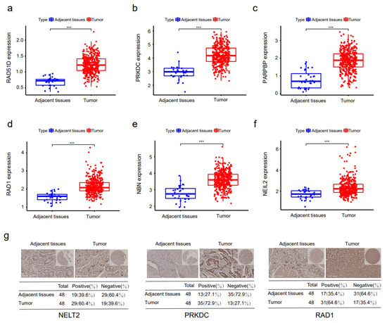 There were 407 STAD patients in the HCC dataset of TCGA, including 375 STAD tissue samples and 32 adjacent normal tissue samples with mRNA sequencing data. The mRNA expression levels of the RAD51D, PRKDC, PARPBP, RAD1, NEIL2, RAD51B, UVSSA, MBD4, and RAD17 genes in STAD tumor tissues were markedly higher than those in STAD tissues, and the difference was statistically significant (Figure 6a–f and Supplemental Figure S1a–d). To make further validation about the differentially expressed DNA repair genes in STAD, we applied immunohistochemical staining in stomach adenocarcinoma cancer tissue microarrays. Immunohistochemistry (IHC) was used to analyze the three genes (PRKDC, NEIL2, and RAD1) that had the most notable differences in STAD tissues compared with adjacent normal tissues (Figure 6g). PRKDC, NEIL2, and RAD1 were expressed at a higher level in STAD tissues. The genes should be verified in larger-scale clinical research, and the function of these molecular biological genes deserves to be explored more deeply.