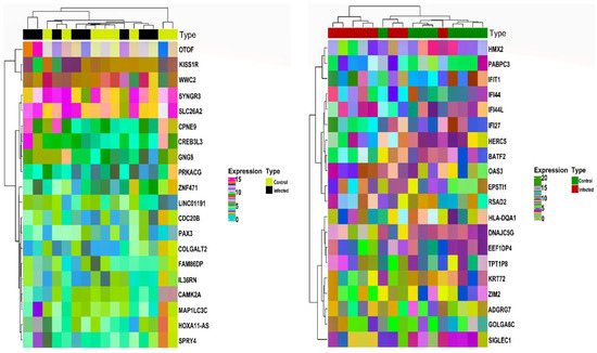 Based on the abovementioned inclusion and exclusion criteria, we selected the HEV mRNA expression profile with accession number GSE36539. The dataset comprised 16 WB patient samples (i.e., eight WB control and eight WB infected) and 16 Mo patient samples (eight Mo control and eight Mo infected). For post-batch correction, we bifurcated the two cell types’ data, with each set comprising 16 samples. After averaging expression values corresponding to duplicate genes, a total of 15991 and 15990 unique gene symbols were retained for Mo and WB sample groups. Corresponding to a p-value and , we obtained and DEGs corresponding to Mo and WB sample groups. After checking via the HGNC multi-symbol checker and filtering by Pigengene, we were finally left with and DEGs corresponding to Mo and WB sample groups. Figure 1 shows the expression heatmap plot of the top down and upregulated DEGs in the case of Mo and WB groups. The sample annotation bars are placed at the top of the heatmap. The most highly up and downregulated DEGs were OTOF [] and HOXA11-AS [] in the case of Mo while RSAD2 [] and GOLGA6C [] in the case of WB.