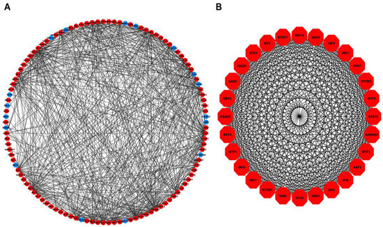 (A) PPI network comprising 114 nodes and 545 interaction edges constructed using the STRING database corresponding to interaction score . The red- and blue-colored nodes signify up and downregulated proteins. (B) Top scoring PPI module comprises nodes and edges. PPI, Protein-Protein Interaction.