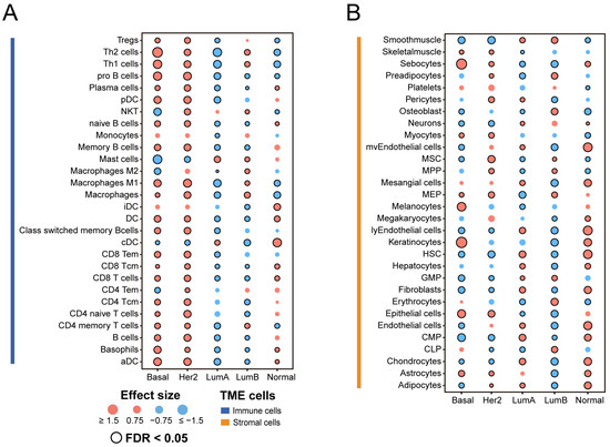 Association between TME cell infiltration levels and breast cancer subtypes: (A) Immune cell composition of breast cancer subtypes. (B) Stromal cell composition of breast cancer subtypes. Effect size is a statistic used to reflect the size of the difference between a specific subtype and other subtypes, with higher and lower scores represented in red and green, respectively. The Mann–Whitney U test was used to calculate the statistical significance of differential cell infiltration levels. The statistically significant results were marked with black circles (FDR < 0.05). Tregs, regulatory T cells; Th, helper T cells; NKT, natural killer T cell; DC, dendritic cell; aDC, activated dendritic cell; iDC, inactivated dendritic cell; pDC, plasmacytoid dendritic cell; cDC, classical dendritic cell; Tcm, central memory T cell; Tem, effector memory T cell.