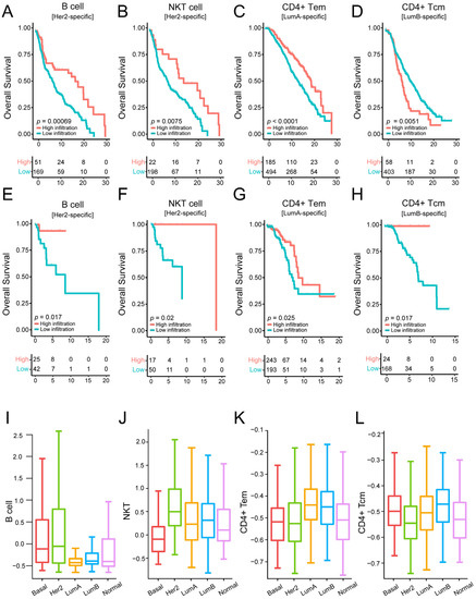 Furthermore, we performed the Kaplan–Meier analysis to investigate whether the above cells could predict OS in their corresponding subtypes. Interestingly, in the HER2-enriched subtype, high B cell infiltration corresponded to longer OS (log rank p < 0.001, Figure 4A), and natural killer T (NKT) cells were associated with improved OS (log rank p < 0.001, respectively, Figure 4B). Moreover, in the Luminal A subtype, high CD4(+) T effector memory cell (Tem) infiltration had better prognostic effects than lower infiltration (log rank p < 0.001, Figure 4C). Finally, we found that high infiltration of CD4(+) T central memory (Tcm) cells was correlated with improved OS in the Luminal B subtype (log rank p < 0.001, Figure 4D). The prognostic results of these specific cells in each subtype are demonstrated in the independent validation set (Figure 4E–H). The results indicate that high infiltration of these cells in the validation set is significantly associated with a good prognosis of the patients, although the statistical significance of some subtypes was weaker than in the training set. This situation was caused by the relatively small number of the samples in each subtype in the validation set. This suggests that cells in specific subtypes may have specific biological functions and prognostic significance. Moreover, the boxplot exhibits a marked difference in cell infiltration among subtypes (Figure 4I–L), and the subtype-specific prognostic cells have a high infiltrating level in the corresponding subtypes.